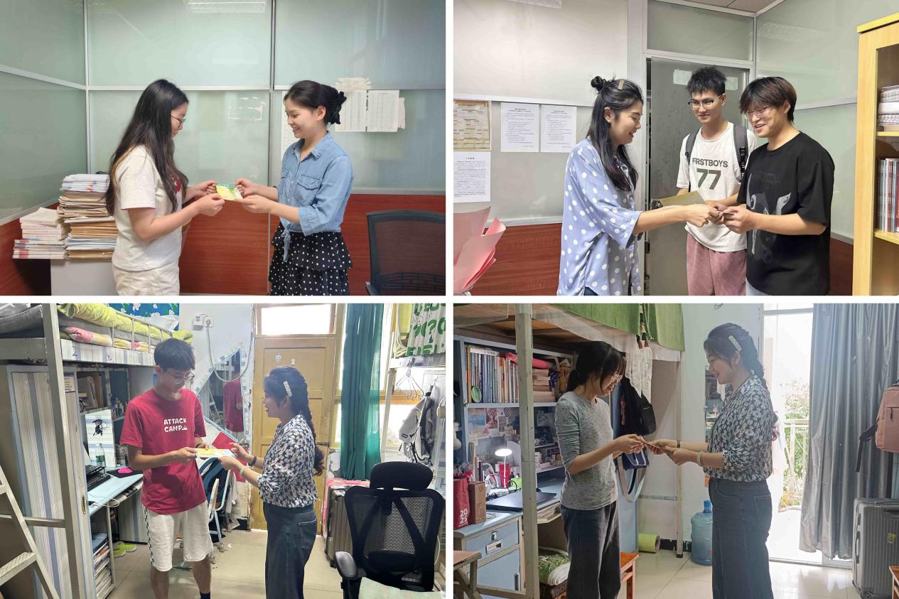 各班级辅导员走访学生宿舍,亲自将慰问券送至学生手中,并同学亲切交流,细致了解大家的生活近况。