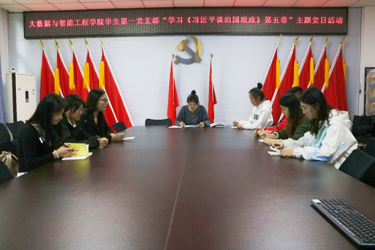 10月24日,学生第一党支部开展“学习《习近平谈治国理政》第五卷”主题党日活动。党支部书记肖佳玲主持会议,支部全体党员参加。