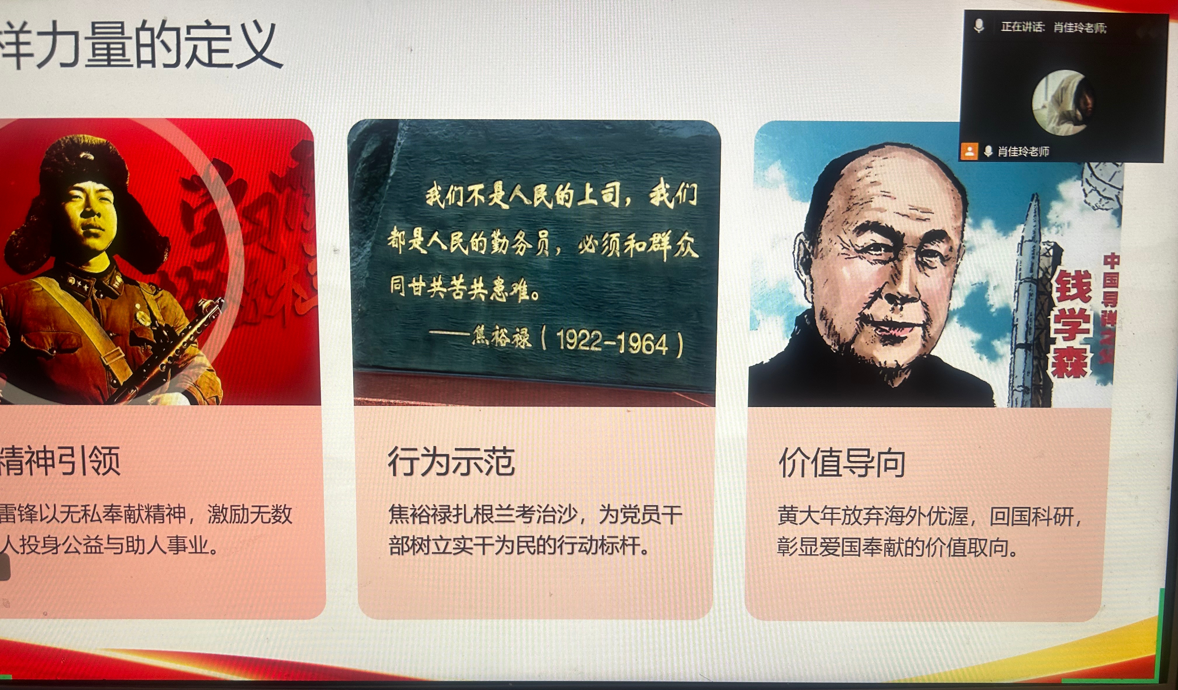 为深入学习贯彻习近平新时代中国特色社会主义思想,进一步加强党员队伍建设,引导学生党员传承红色基因,汲取奋进力量,12月22日,党支部书记肖佳玲通过腾讯会议开展主题党课活动。