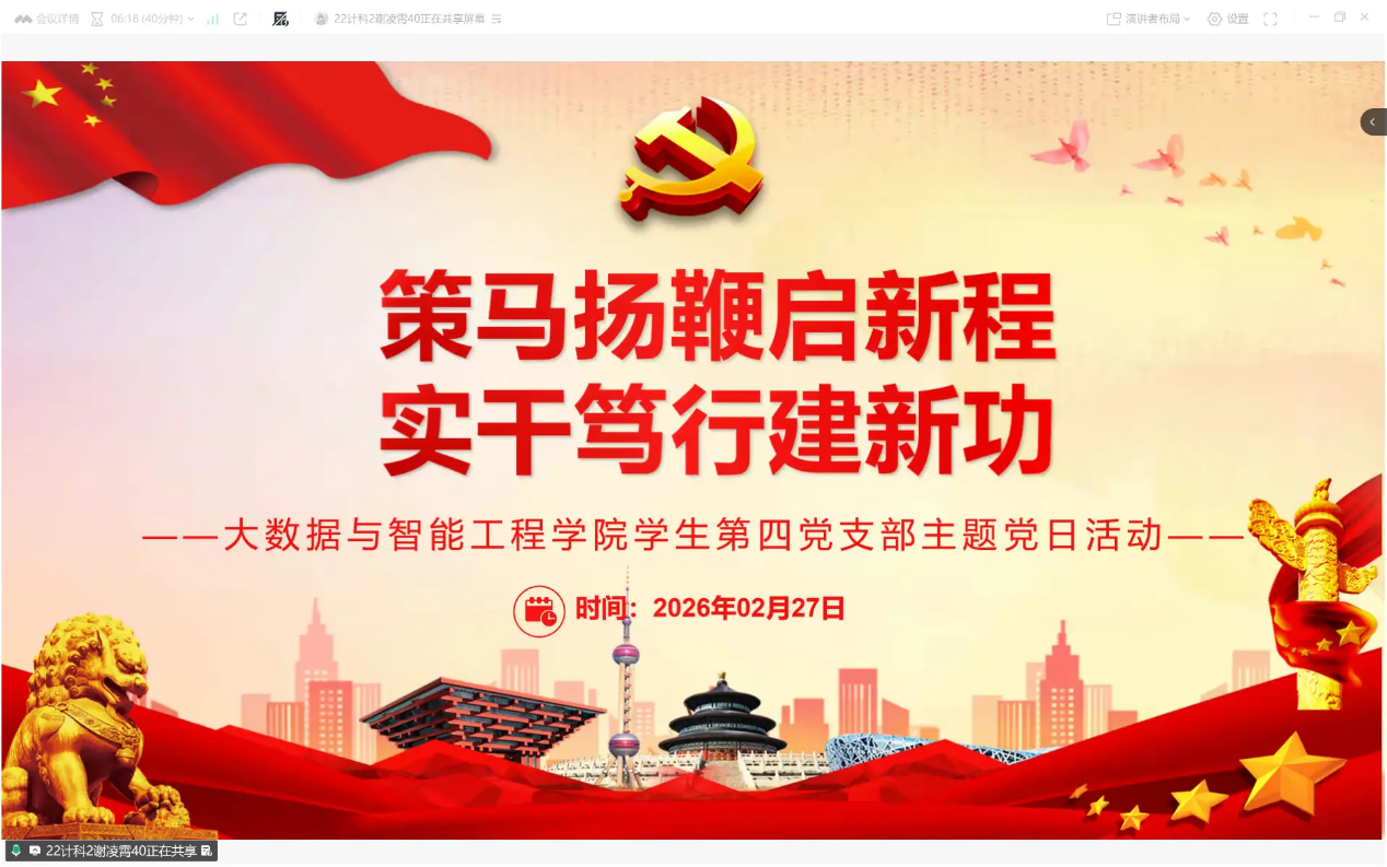 2月27日,学生第四党支部开展“策马扬鞭启新程,实干笃行建新功”主题党日活动,党支部书记李愉主持会议,党支部全体党员参加。